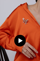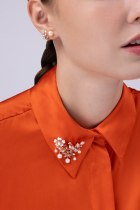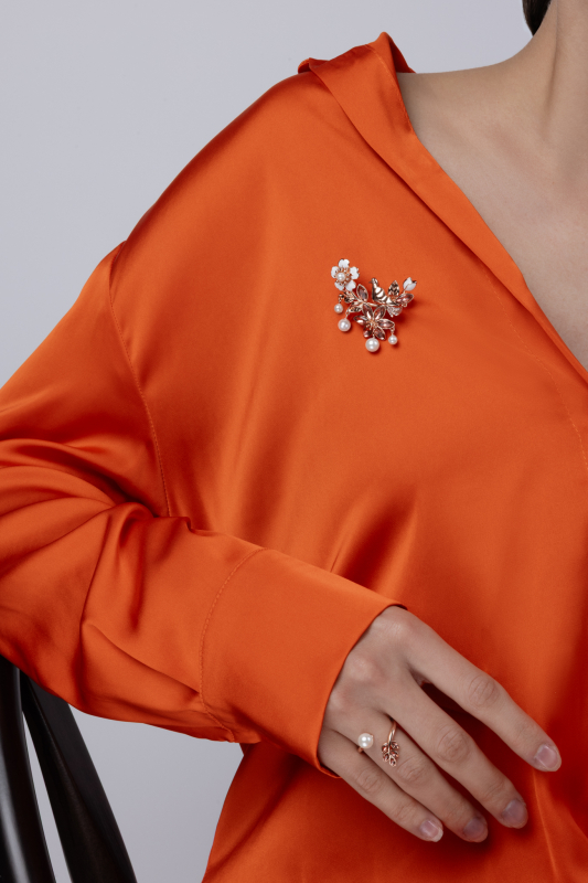Różowo-złota broszka Troskliwa Gołąbka z motywem kwiatów kwitnących majowych drzew i troskliwej gołąbki z białymi perłami z muszli, będzie eleganckim akcentem do każdej stylizacji.