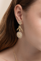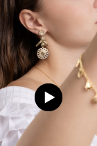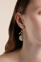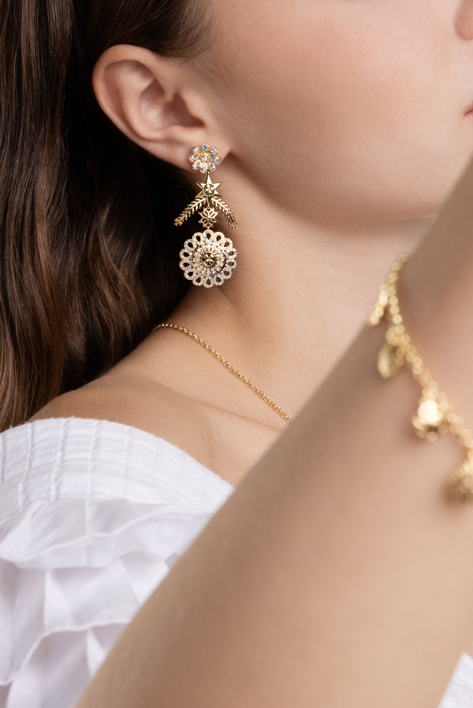 Kolczyki „Harmonia i Ochrona” w złocie z kryształami AB. Składają się z pięciu głównych symboli o funkcji ochronnej, symbolizujących harmonię, płodność i dobrobyt.