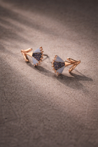 Mosiądz z recyklingu złocony różowym złotem, sztyft ze stali chirurgicznej, czeski kryształ, emalia jubilerska.
