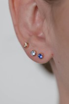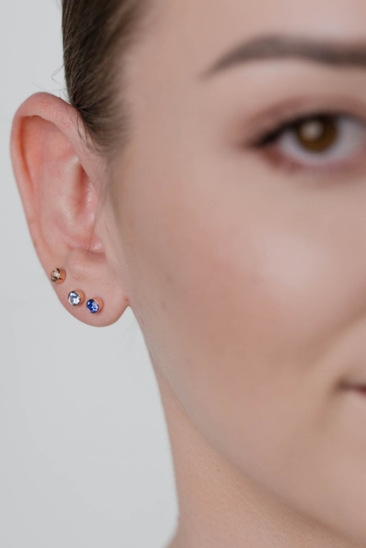 Małe kolczyki z małym ciemnoniebieskim kryształkiem pośrodku. Kolczyki są uniwersalne i można je nosić również jako piercing.