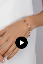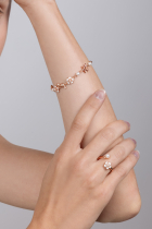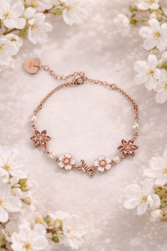 Różowo-złota bransoletka Kwitnący Maj z dominującym motywem kwiatów kwitnących majowych drzew i małą troskliwą gołąbką z białymi perłami z muszli.