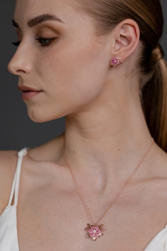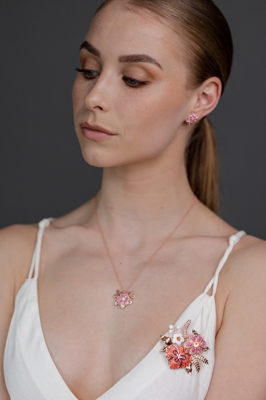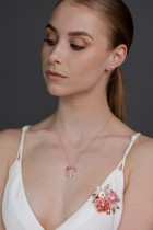 Wisiorek z łańcuszkiem z różowym kwiatkiem pomalowany biżuteryjną emalią, poświęcony słowackiej pisarce Terezii Vansowej i inspirowany wyszywanymy kwiatami na spódnicy stroju ludowego z jej rodzinnej wsi Zvolenská Slatina. Seria powstała z szacunku dla czołowych słowackich pisarek i zainspirowana ponadczasowymi dziełami sztuki, które napisały i z których generacje czerpią do dziś. Niech te niewiędnące kwiaty przypominają o ich nieskończonej wielkości i wieczności.